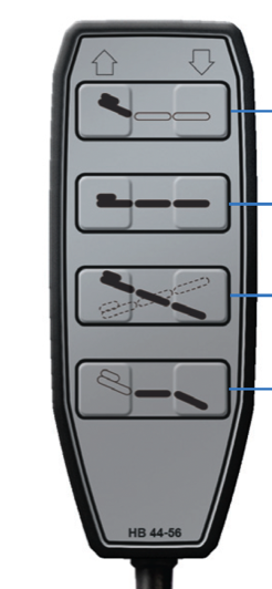 Linak motors are the gold standard; ask if your bed-to-be has one. Ideally, the bed control has four button pairs — head up/down, whole bed up/down, tilt up/down, legs up/down, as shown below.